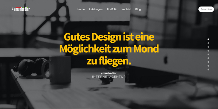 Redesign 4musketier 4musketier RSS Profil 4musketierEinträgeNetzwerk 2Kontakt zurück weiter 1 So simple wie möglich – so das Motto für dieses Projekt. Das galt es auch, für unseren neuen Internetauftritt umzusetzen. Kombiniert mit dem verspielten CI mit seinen vielen bunten Schriften. Redesign 4musketier 4musketier Internetagentur © 2016 Teilen Xing Facebook Twitter LinkedIn Pinterest Whatsapp Per E-Mail weitersagen